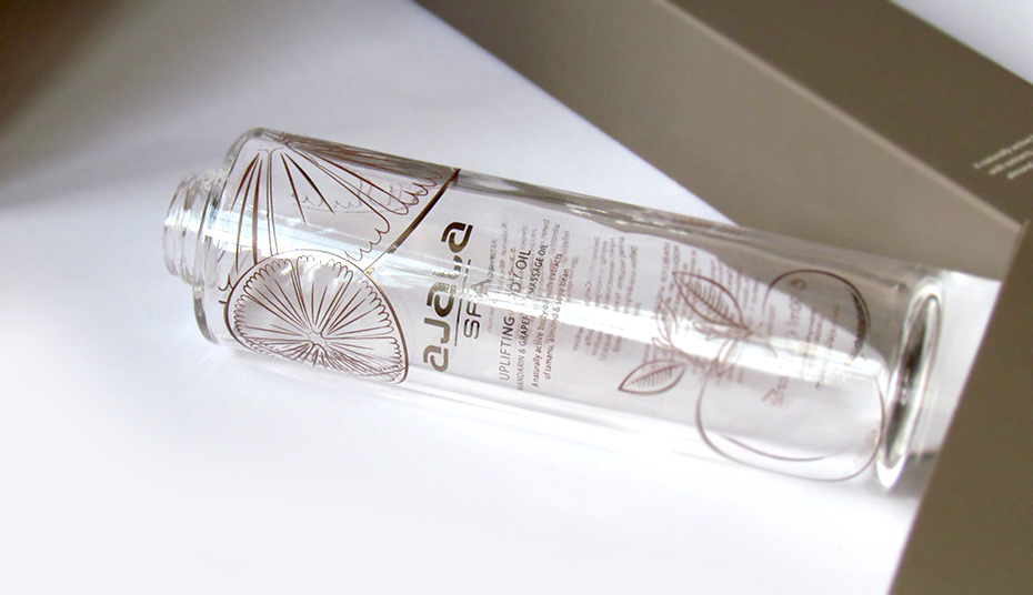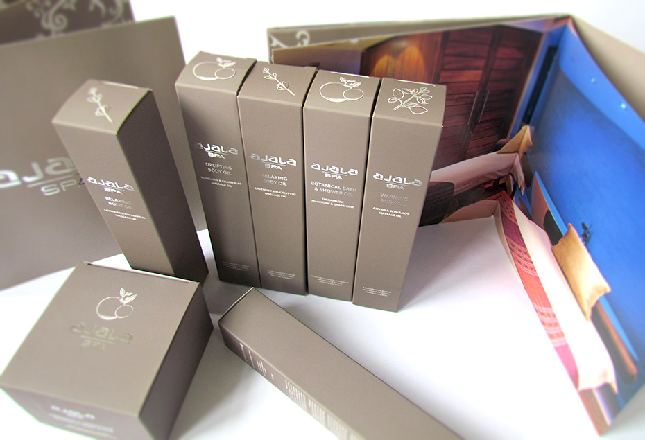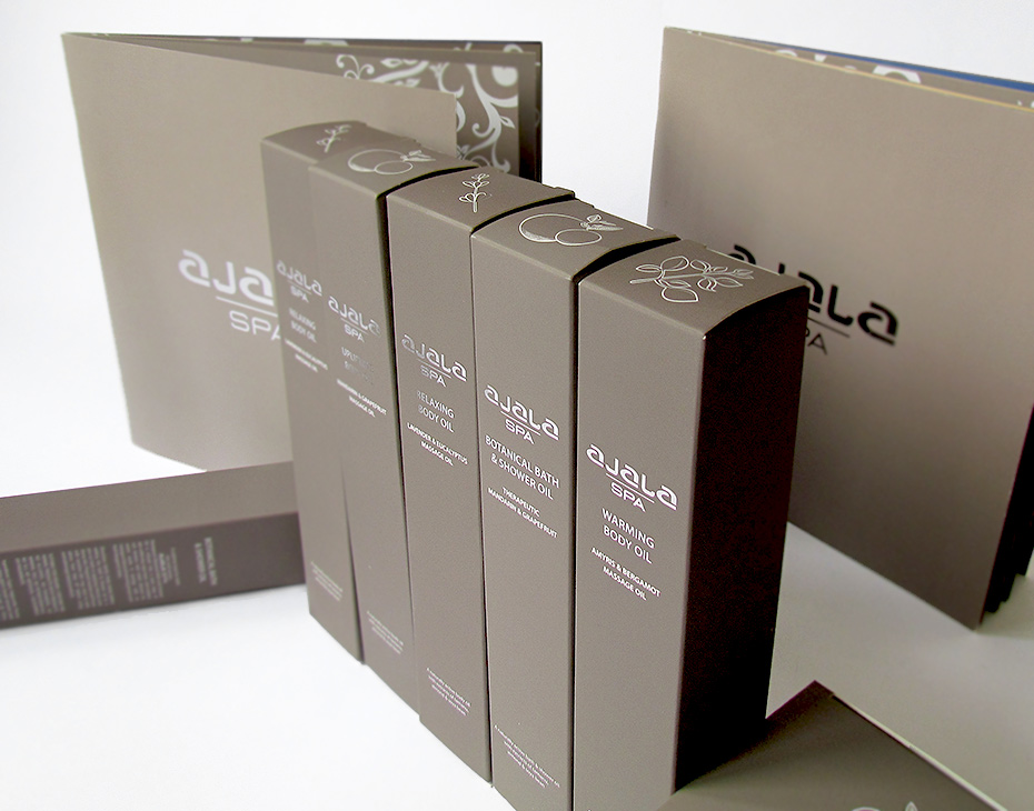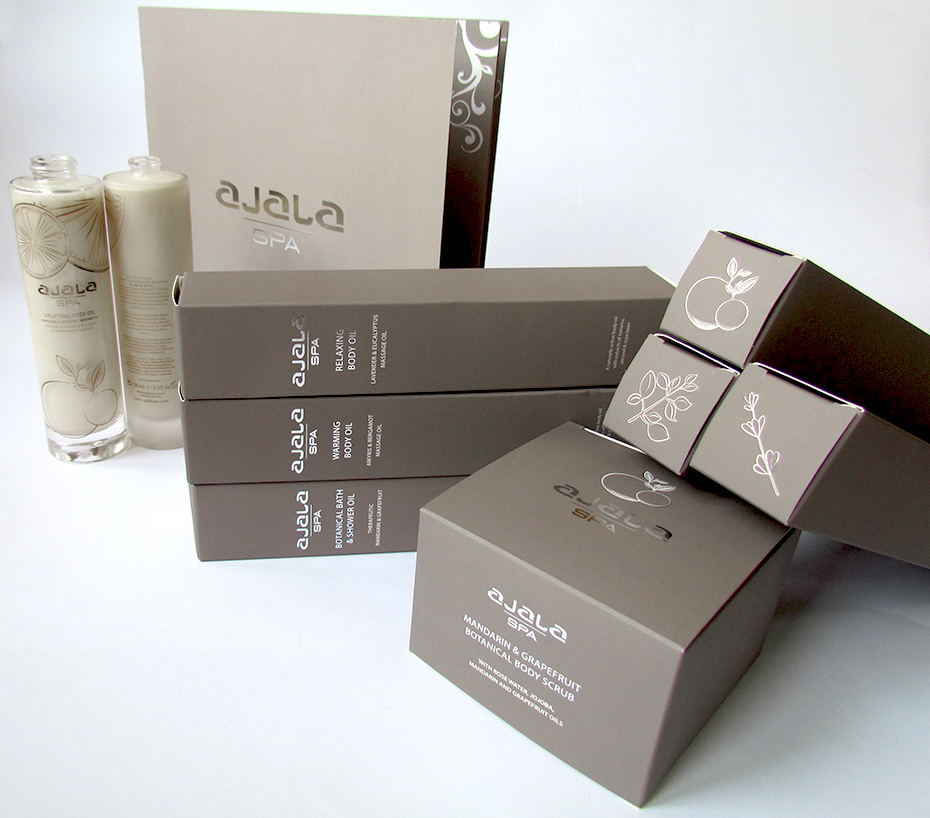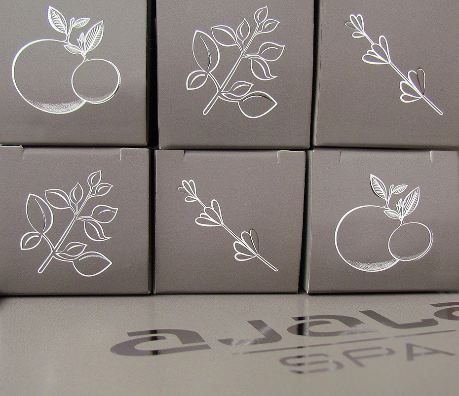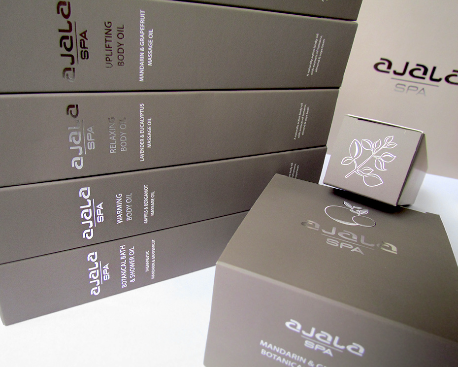 Bottles and boxes for Ajala Spa’s massage- and therapeutic oils and facial scrub. I used silver foil and matt lamination on the boxes and hot foil stamping on the frosted and transparent bottles. It was a long process to find the right colours, technique and paper stock – I had to keep in mind how the product would look when touched with oily hands. To help spa staff identify the content of each box easily, there’s an illustration of the main product ingredient on the lid. These products and brochures were designed in 2011.