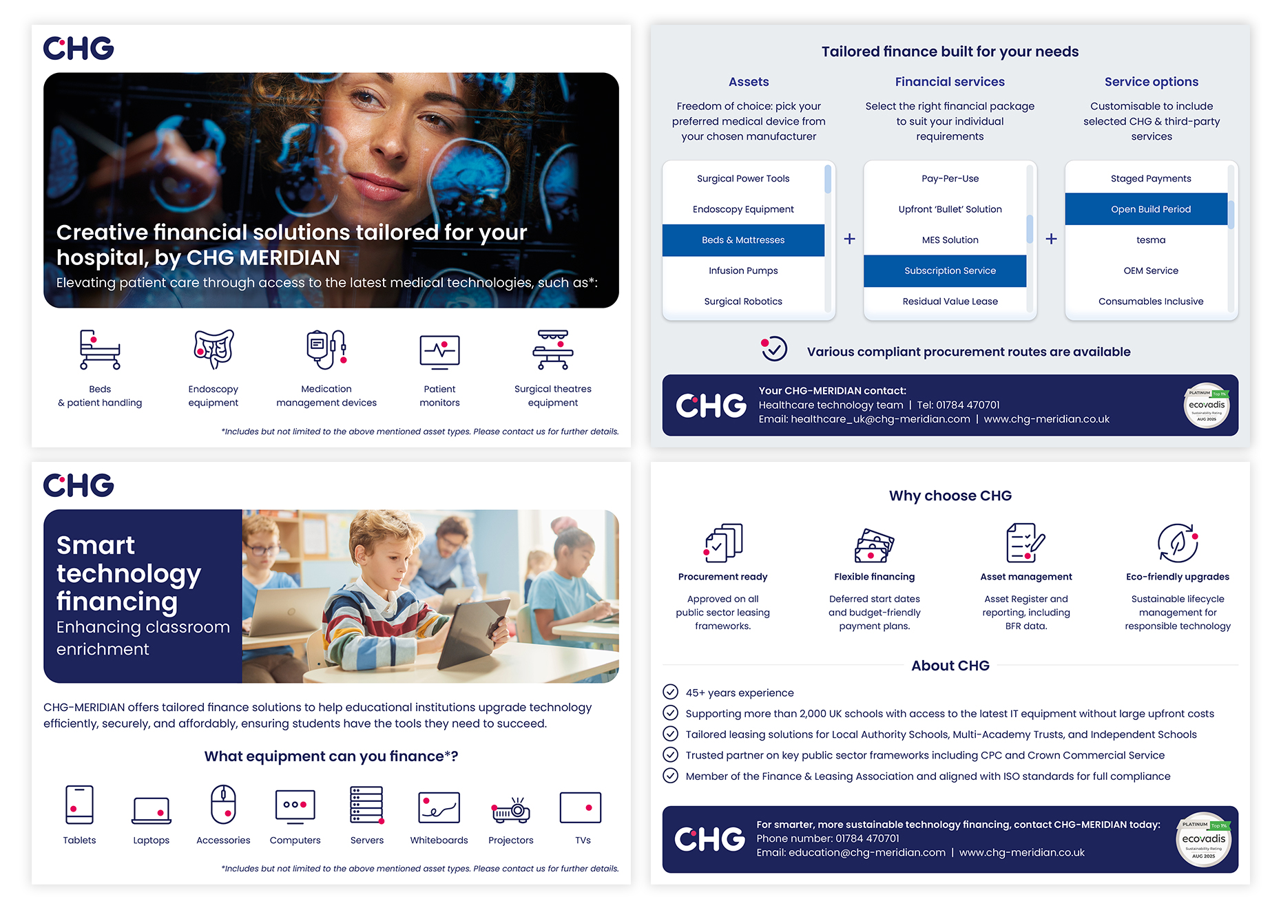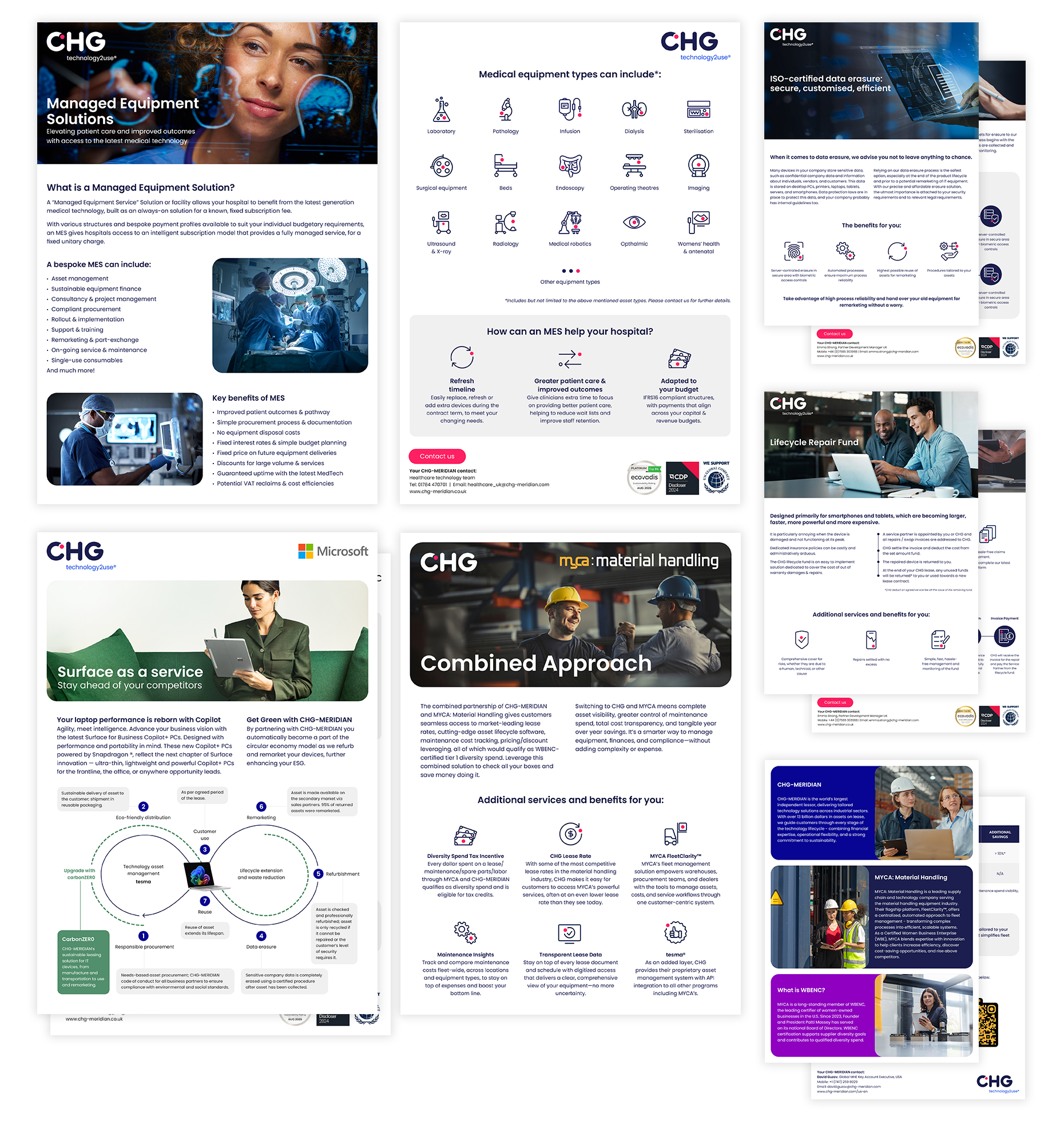 One of my key long-term freelance clients is the UK and US branch of CHG-MERIDIAN, with whom I collaborate via the agency Passionfruit. Over the course of our partnership, I’ve created a wide range of brand-aligned collateral; everything from editable Word templates and printed flyers to event materials, booth designs, and sector-specific PDFs for the healthcare, industrial, and IT markets. This ongoing collaboration has allowed me to work closely with their updated brand guidelines and deliver consistently high-quality, versatile design solutions.