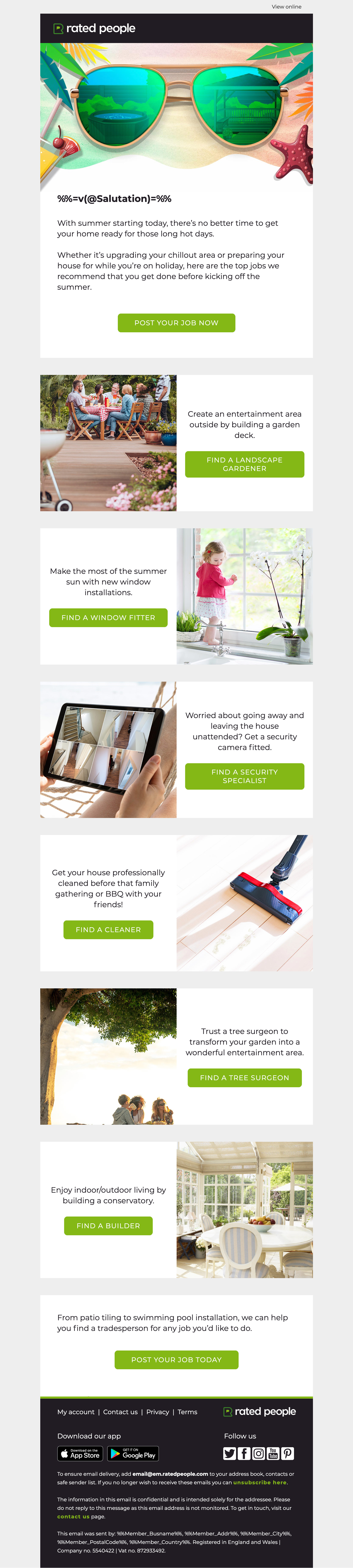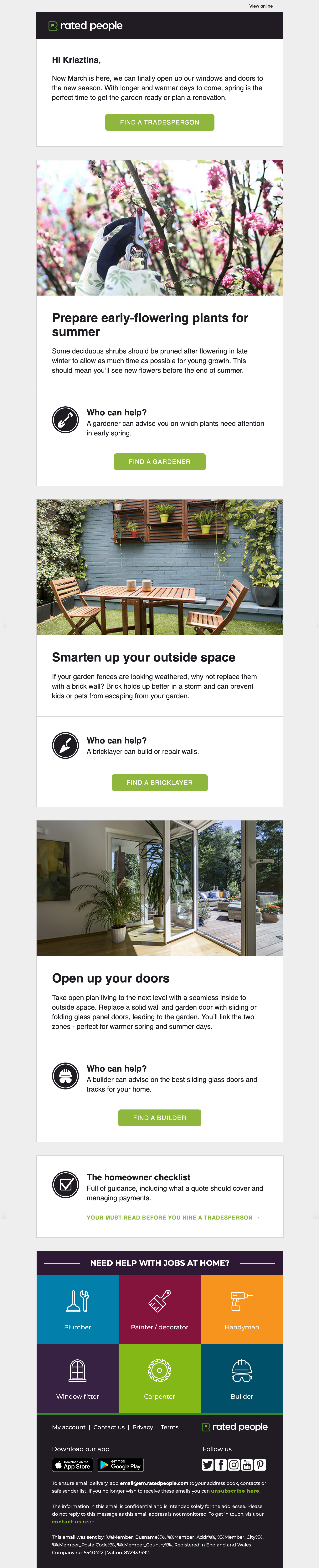 During my time at Rated People (2016–2022), I was responsible for designing and building responsive email newsletters aimed at inspiring homeowners to take on home improvement projects. These emails, created in Salesforce Marketing Cloud, featured custom-built, reusable content blocks, often with animated header images, and bespoke themes, including seasonal and ad-hoc campaigns like the Jubilee email shown below. The layouts were responsive, accessible, and mobile-friendly, with clean stacking blocks, and mobile-optimised images. The goal was to drive engagement through clear calls to action, encouraging users to visit the Rated People app or website to post jobs and connect with trusted tradespeople. These campaigns played a key role in boosting homeowner activity and generating high-quality leads for our trade professionals.