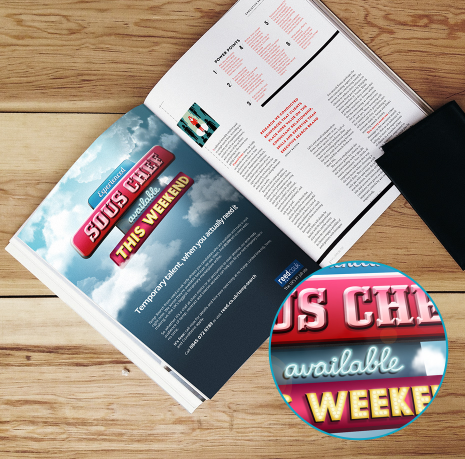 reed.co.uk magazine ad for recruiters to promote a new product. I wanted to use neon signs similar to the ones in the latest reed.co.uk TV-ad. I created the signs in Illustrator and built the scene with the clouds in Photoshop.