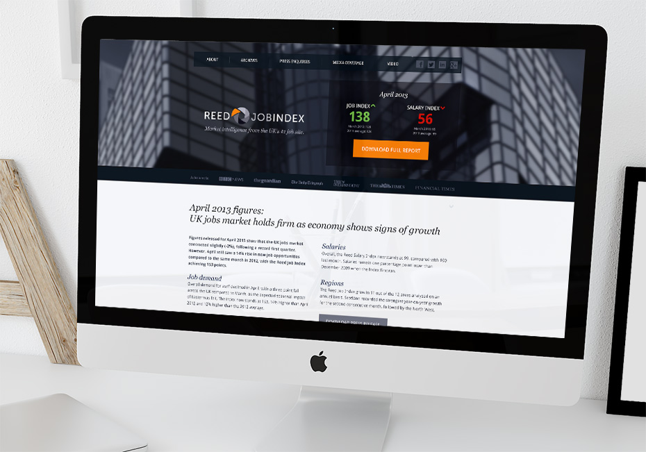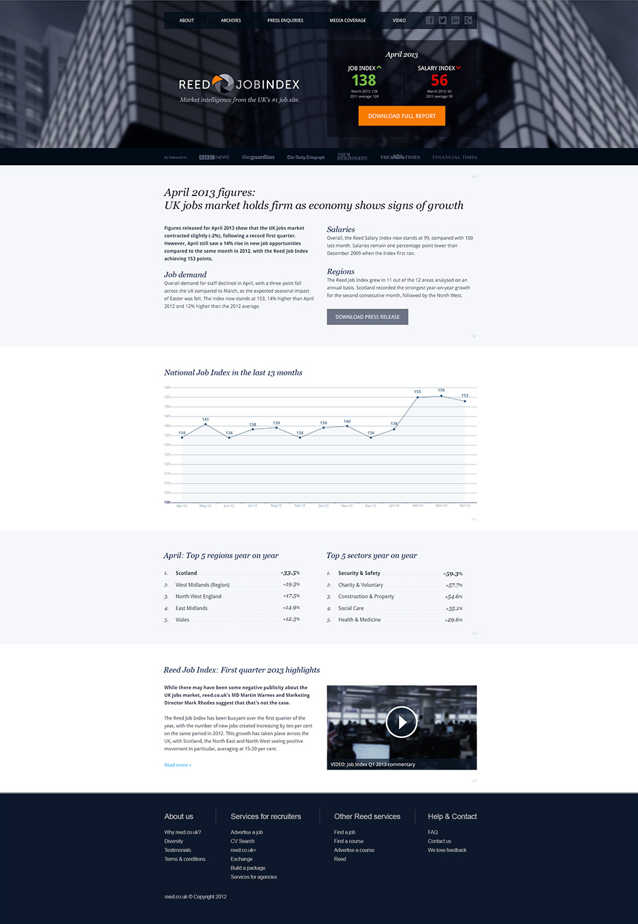 The Reed Job Index is a monthly report for recruiters which gives a snapshot of the recruitment market’s current state and provides detailed data of the leading sectors. I used this snapshot-concept when designing the logo and the website in 2012. This was a minimalistic and very functional website; the dynamic, animated JavaScript charts were provided by Highcharts.